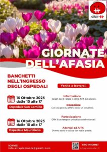 In occasione del mese di ottobre, dedicato all’afasia, siete tutti invitati a partecipare all’iniziativa di A.IT.A. Piemonte ,volta ad informare sull’AFASIA e a supportare coloro che ne sono colpiti. Venite a trovarci numerosi, saremo felici di accogliervi presso i banchetti che verranno allestiti all’ingresso degli ospedali, con tante coloratissime piantine di ciclamini: 15 ottobre- Ospedale San Camillo-Strada Comunale Santa Margherita n.136 Torino 16 ottobre- Ospedale Mauriziano- Largo Filippo Turati n.62 Torino